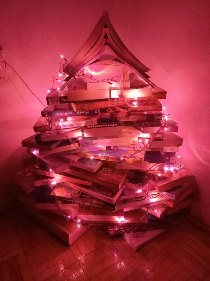 -Prošle godine sam kod nje na slikama videla takvu jelku i poželela da je napravim. Stalno čitam i član sam Gradske biblioteke, pa kući nemam toliko knjiga. Zato sam od prošle godine počela da ih kupujem. Gde god naiđem na knjigu koja mi se sviđa, kupujem. Od novembra 2019. godine do sada prikupila sam tridesetak knjiga. Sada imam jednu svoju skromnu početničku biblioteku- kaže Maja.
