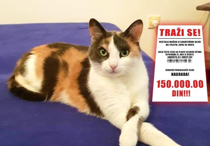 - Nestala mačka u Subotičkoj ulici na Telepu. Zove se Mici. Belo-žuto-siva sa plavo zelenim očima. Čipovana. Ako je vidite zadržite je i javite se. Dobrom pronalazaču sledi nagrada 150.000 dinara - napisao je vlasnik koji na sve načine pokušava da pronađe svoju ljubimicu.