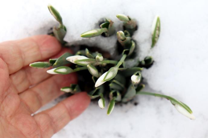 Beli, još nedovoljno rascvetali cvetovi, na zelenim stabljikama, probili se kroz snežni pokrivač, najava toplim danima, ili je visibaba, jednostavno poranila.