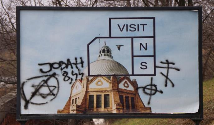Na bilbordu koji je deo kampanje za turističku promociju Novog Sada i koji je i pre mesec bio na meti vandala, opet su bile ispisane antisemitske poruke u vidu precrtane Davidove zvezde, neonacističkog keltskog krsta, skraćenice "SS" za nacističke vojne jedinice "Schutzstaffel" i drugo.