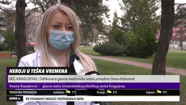 Pored lekara, verovatno najveće opterećenje u radu u crvenim zonama pretrpele su medicinske sestre. Jedna od njih je i glavna sestra Univerzitetskog kliničkog centra Kragujevac Vesna Kazaković, koja je zbog toga odlikovana je sretenjskom medaljom za zasluge u borbi protiv koronavirusa.
