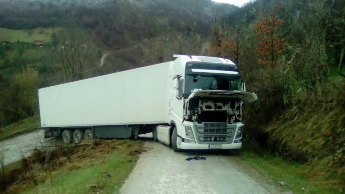 -Video sam šleper kako prolazi selom a onda i kada je stao u uskoj, oštroj krivini iznad sela. Vozač je, manevrišući pokušao da se izvuče, da nastavi put, ali je opet proklizao, prikilica je sasekla krivinu, stao je, nije mogao ni napred ni nazad - reči su Gorana Removića, meštanina Radoševa.
