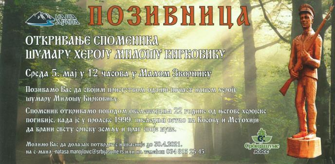 05. maja 2021. godine u 12.00 sati, u naselju Čitluk, opština Mali Zvornik otkrivanju spomenika šumaru heroju Milošu Ćirkoviću.