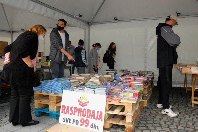 Na Trgu Srpskih ratnika u Kraljevu jedna izdavačka kuća iz Niša u ponedeljak je postavila tri štanda za prodaju knjiga, čije su cene po primerku 99 i 299 dinara, a gužva se stvorila za tili čas.