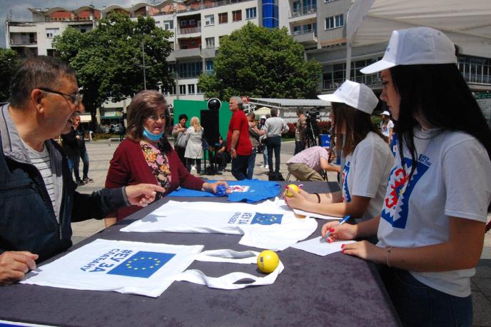 Građani Kraljeva tokom boravka Karavana EU bili su u prilici da pogledaju interaktivnu izložbu i pogledaju zanimljive video priče o podršci i saradnji Srbije i EU, da se fotografišu sa motivima i znamenostima evropskih gradova i dobiju fotografiju na poklon, a najveće interesovanje vladalo je za besplatne majice i cegere koji su štampani i deljeni na licu mesta.
