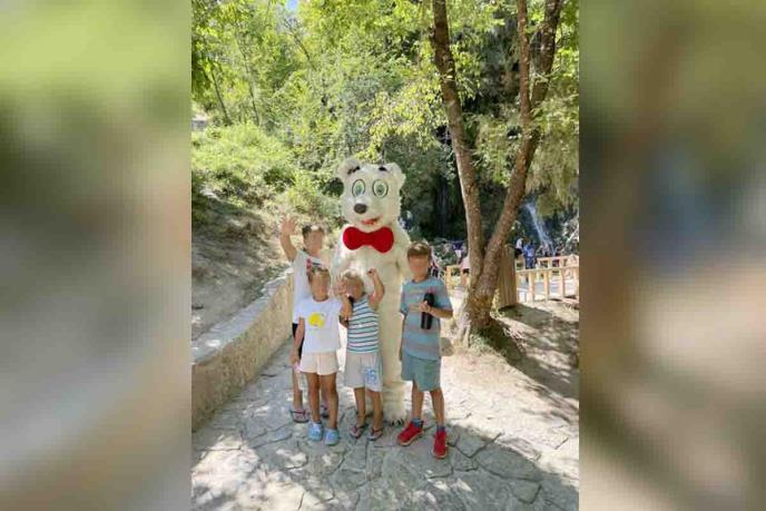 Zemlja gori, sunce sprži sve i na Zlatiboru, ovaj čovek je pod krznom medveda! Sreten Novaković, svi znan kao Rukajlo, dočekuje mališane kod vodopada u Gostilju! Ko hoće da se slika koji dinar treba da ostavi.