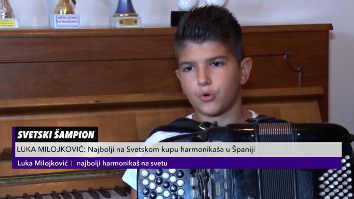 Ovo je Luka Milojković iz Nisa, ima 12 godina i najbolji je harmonikaš na svetu. Iako se za njegov uspeh malo zna u Srbiji, ovaj virtuoz na harmonici broji već deset prvih nagrada u zemlji i regionu. Na Internacionalnom umetnickom takmičenju koje je juna ove godine održano u Španiji proglašen je najboljim u kategoriji od 10 do 12 godina.