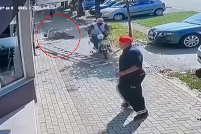 Stariji gospodin se mimoišao sa biciklistom i nije primetio da se ispred njega nalaze merdevine na kojima je majstor.