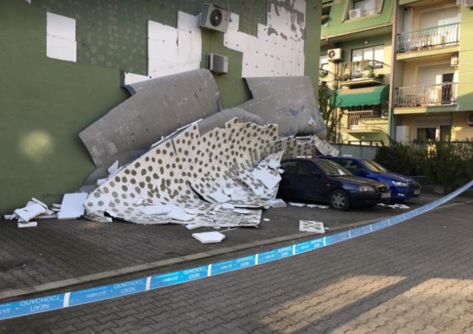 Delovi fasade zgrade u Ulici Kolo srpskih sestara 18, na Grbavici, otpali su i naneli površinske štete na parkiranim vozilima.