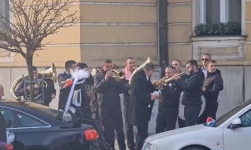 UŽICE - Simpatični snimak iz Užica obišao je Srbiju a na njemu se vidi kako se vidno raspoložen i doteran kum nasred ulice veseli i kiti trubače, objavila je Užice oglasna tabla.