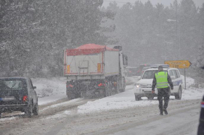 Na kolovozu je do 10 cm ugaženog snega pa je put jako klizav. Sneg i dalje pada.