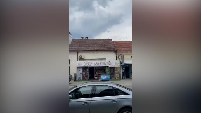 Na snimku se mogu videti dva psa koja su popela na krov policijske stanice u Lešnici.