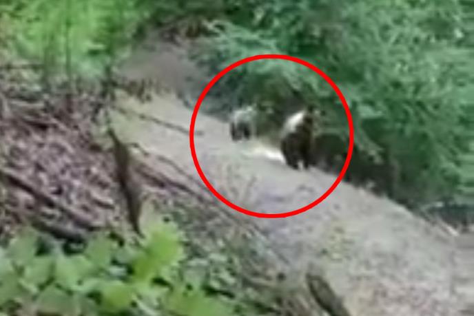 Na video snimku koji kruži društvenim mrežama vidi se najpre prazan šumski put, a zatim iznenada nailazi mečka sa mečetom.