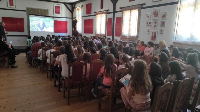 Nakon obilaska stalne muzejske postavke, učenici su pogledali dokumentarno-etnološki film „Darovi Župe Aleksandrovačke“.