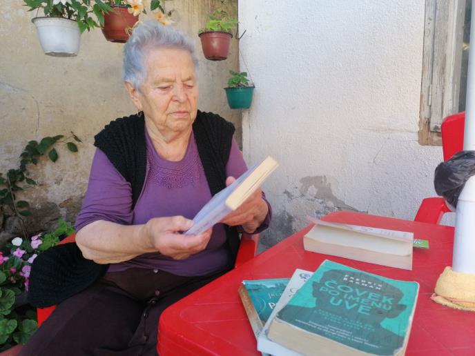 - Kad mi je suprug preminuo, pošto nismo imali dece, ostala sam sasvim sama. Vreme sam kratila šivenjem, kako bih razgovarala s ljudima, jer su mi dolazili. Onda sam počela da vezem i sve to sam poklanjala. Ali vid mi je oslabio i nisam više mogla, pa sam se pre deset godina učlanila u biblioteku. Knjige su moj razgovor sada i bez njih ne mogu - počinje priču baka u svom malom, ali lepo sređenom dvorištu.