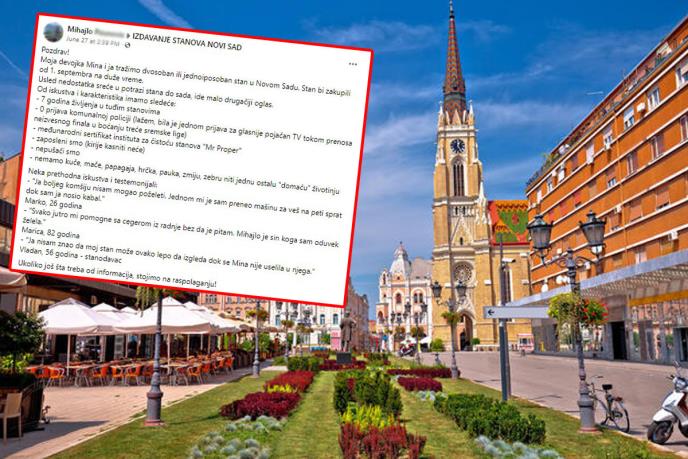 "Pozdrav! Moja devojka Mina i ja tražimo dvosoban ili jednoiposoban stan u Novom Sadu. Stan bismo zakupili od 1. septembra na duže vreme. Usled nedostatka sreće u potrazi stana do sada, ide malo drugačiji oglas.