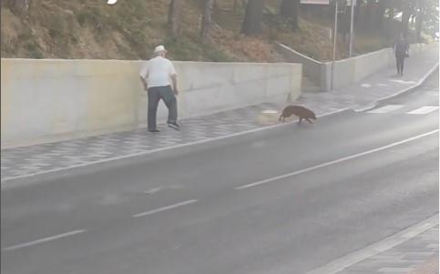 Navodno, kako se navodi na mrežama, reč je o snimku iz Užica a na kojem se vidi vremešni čovek koji ide pored puta i sve vreme tera i gađa psa koji se tu našao.