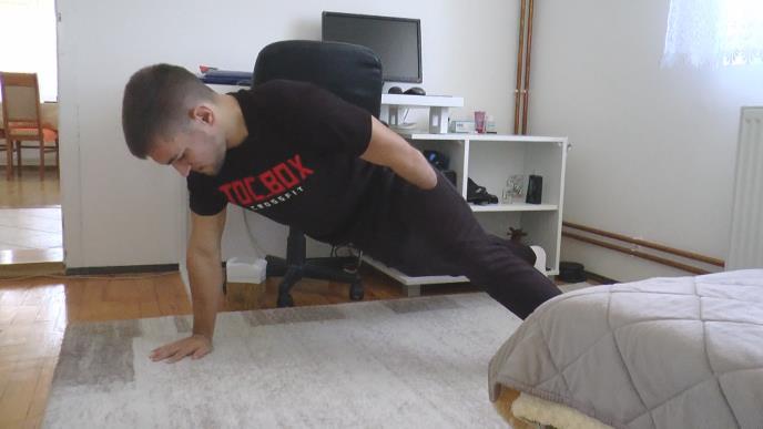 - Кad završim jutarnji trening sa trčanjem, dolazim u moju sobu, gde sam svakodnevno vežbao pomoću nekih sprava koje su pomagale da se delovi tela razvaju normalno da kasnije ne bih imao zdravstvenih problema, bol u leđima i krivu kičmu, jer mi nedostaje nekih 60 centimetara leve ruke. Počeo sam da vežbam obične, a zatim i vojničke sklekove koji su najteži. Oslanjajući se na jednu nogu i jednu ruku i odabiranjem idealnog položaja, počinjem zagrevanje a samim tim i uvežbavanje - kazao je Davor.