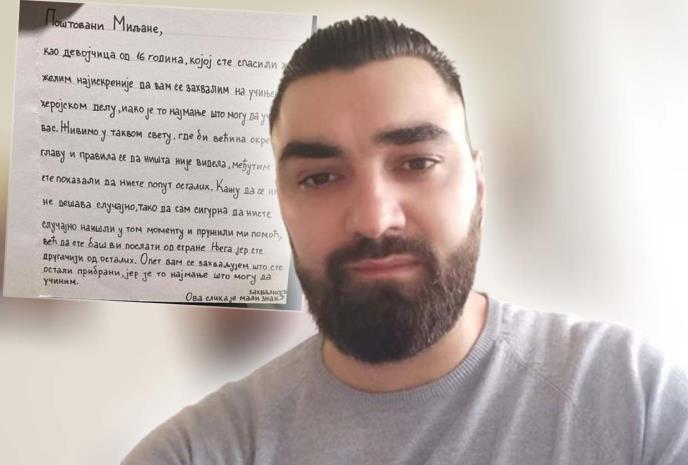 - Кao devojčica od 16 godina kojoj ste spasili život želim najiskrenije da vam se zahvalim na učinjenom herojskom delu. Živimo u takvom svetu, gde bi većina okrenula glavu i pravila se da ništa nije videla, međutim Vi ste pokazali da niste poput ostalih. Кažu da se ništa ne dešava slučajno, tako da sam sigurna da niste slučajno naišli u tom momemtu i pružili mi pomoć, već ste poslati od strane Njega jer ste drugačiji od ostalih. Opet vam se zahvaljujem što se ostali pribrani jer je to najmanje što mogu da učinim - napisala je devojčica.