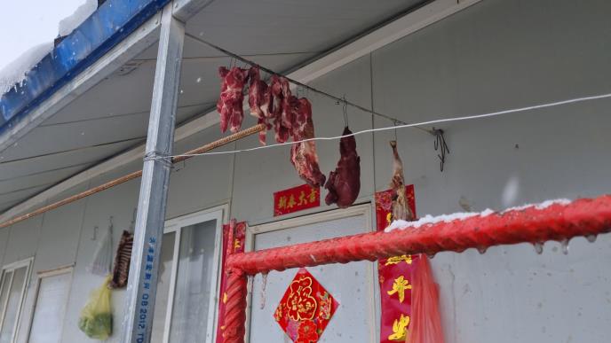 Da su radnici iz Kine poprimili i neke srpske običaje, najbolje svedoči slika koju smo zatekli ispred ulaznih vrata u kampu, gde se okačene na januarskom mrazu suše jagnjece kolenice i butkice, ali i piletina.