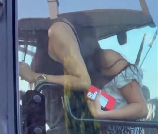 Mladi traktorista na snimku kabinu deli sa dve atraktivne devojke, koje mu prave društvo u zanosnim krpicama.