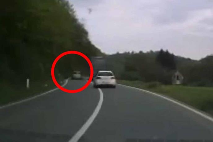 Naime jedan automobil pretiče kamion preko pune linije u krivini i za dlaku izbegava sudar sa vozilima koji mu idu u susret.