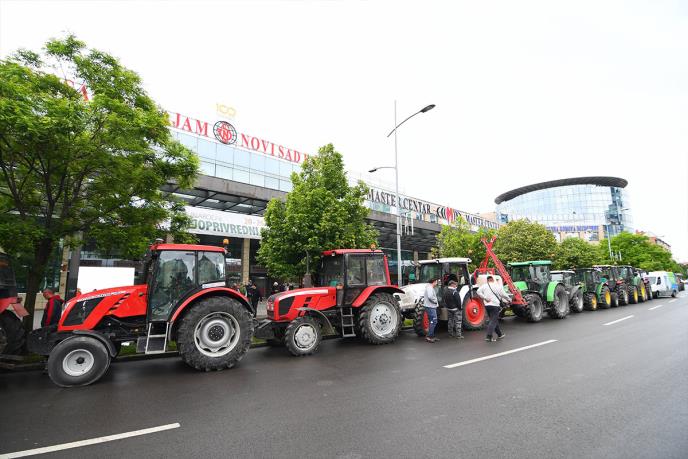 Poljoprivrednici sa više desetina traktora okupili su se danas ispred Novosadskog sajma, u jednoj od kolovoznih traka, kako ne bi blokirali saobraćaj.