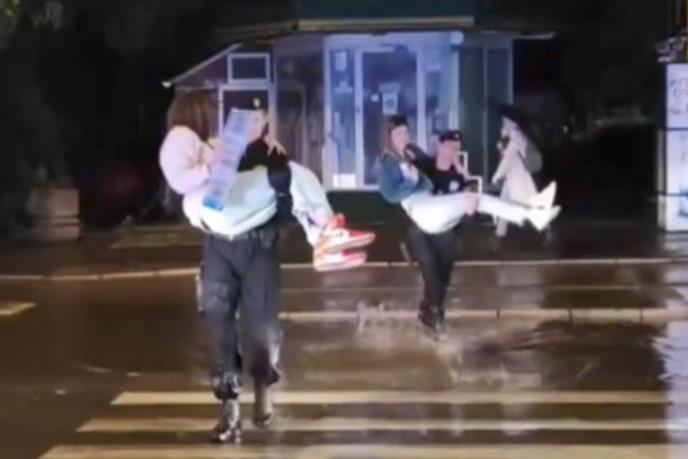 Naime, na društvenim mrežama pojavio se snimak dvojice policajaca koji su nosili dve devojke preko potopljenih ulica, na bezbedno mesto.