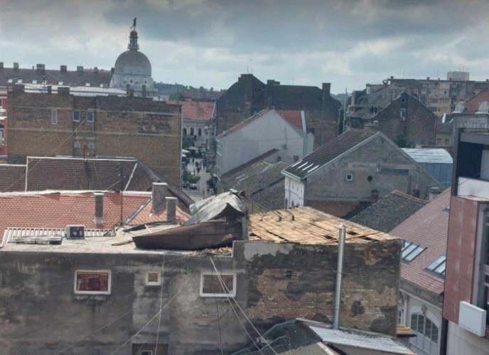 Nekoliko stanova uništeno je u Fruškogorskoj 4. Oluja je odnela krov, koji je nakon toga ošteti i Naučno-tehnološki park. Kako se vidi na snimku stanovi su u potpunosti uništeni. Jučerašnje nevreme odnelo je i drugi deo krova fiskulturne sale OŠ "Jožef Atila" na Telepu, koja je bila pogođena i u nevremenu u sredu.Nekoliko roditelja uzelo stvar u svoje ruke u pokušaju da saniraju najveću štetu.