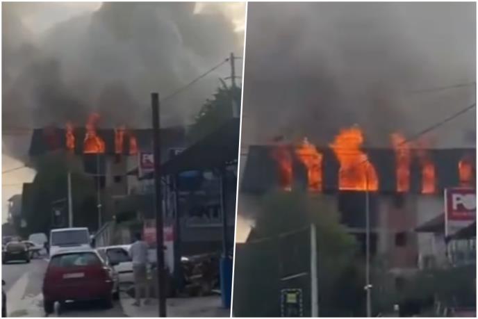 Kako se može videti na snimku koji se širi mrežama, vatra guta krov na nedovršenom objektu, a crni gusti dim širi se na sve strane.