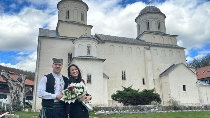 Međutim, budući mladoženja Srđan Novaković iz Priboja, nije želeo da taj čin obavi u nekoj svetskoj metropoli, uz baklje i slične rekvizite, već se odlučio za tradiciju. Obučen u srpsku narodnu nošnju, svoju devojku Kristinu verio je u manastiru Mileševa.