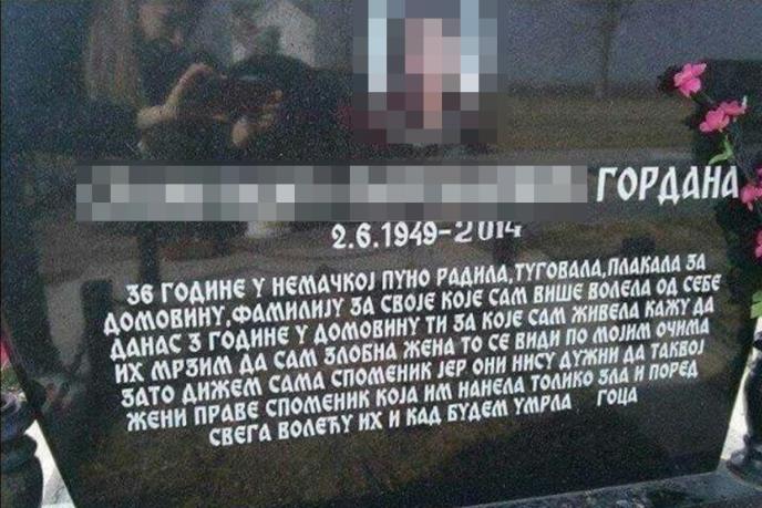 "36 godine u Nemačkoj puno radila, tugovala, plakala za domovinu, familiju, za svoje koje sam više volela od sebe. Danas 3 godine u domovinu ti za koje sam živela kažu da ih mrzim da sam zlobna žena to se vidi po mojim očima. Zato dižem sama spomenik jer oni nisu dužni da takvoj ženi prave spomenik koja im je nanela toliko zla. I pored svega voleću ih i kad budem umrla", poručila je Goca porodici.