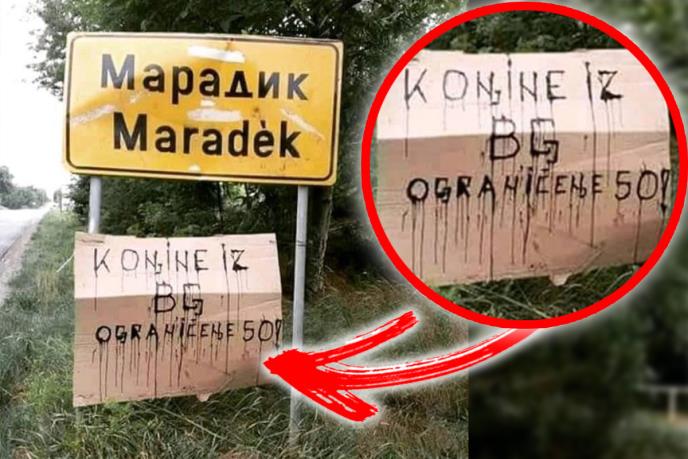 "Konjine iz BG, ograničenje 50", navodi se ispod table na ulazu u Maradik. Poruka jeste uvredljiva, ali odnosi se na one koji imaju "tešku" nogu na gasu.