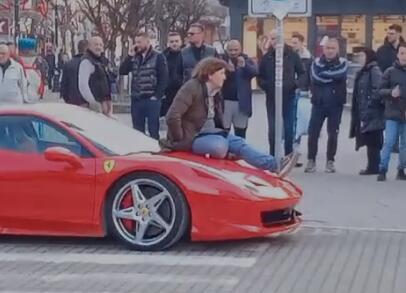 ŠOK SCENA U NOVOM PAZARU, SVI U NEVERICI GLEDAJU: Parkirao ferari nasred grada, ŽENA MU SE POPELA NA HAUBU (VIDEO)