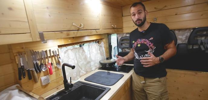 Drugi omiljeni deo mu je kuhinja, a magnet mu drži escajg, ima sudoperu, slavinu, skupu i tešku, koju nije morao da kupi, ali mu se sviđa... Voda je tekuća, na pumpu od 12 volti, a šporet na plin... Gore je stavio viseće elemente u koje mu staje sve, a ispod led traku koja mu štedi struju pa kad radi ne mora da pali ostala svetla...