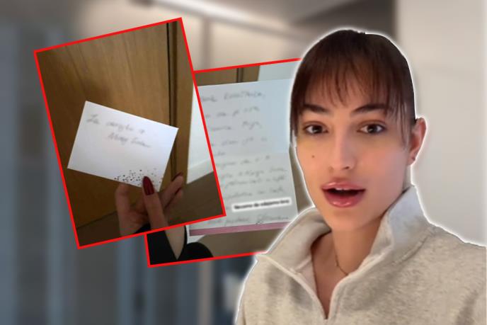 "Ustajem da odradim svoju rutinu i odlazim u teretanu, imam teretanu u zgradi. Da izađem napolje vidim porukicu ispred vrata i na srpskom nešto piše, a ja sam inače u Londonu. "Za devojku iz Novog Sada", ja u šoku, reko neko je pronašao gde živim. Otvaram to, unutra porukica i 100 dinara. Ja gledam, okej i u koverti piše "pronašli smo ovo u hodniku pretpostavljamo da si ti devojka koju smo sreli u liftu" i meni tad klikne. Pre dva, tri meseca srela sam par u liftu i htela sam da pomazim psa i čovek je rekao "dobro, dobro je", i povukao psa. Ja pogledam, pitam odakle ste, mislim da su rekli iz Beograda i da žive u zgradi i to stan prekoputa mog", ispričala je ona u videu koji je objavila na Tiktoku.