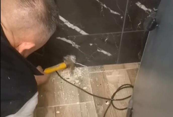 Na snimku se vidi čovek koji čekićem razbija pločice, a potom i rigips. Kada je napravio rupu u zidu, nožem je polako sklanjao višak kako bi uspeo da dohvati mače.
