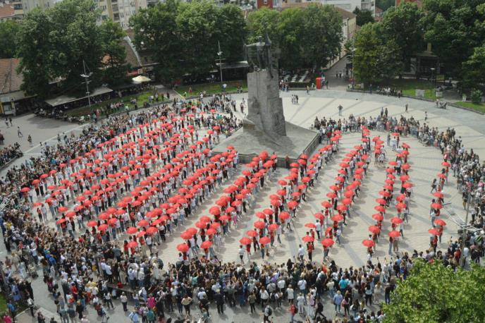 STOTINE MATURANATA IZ KRALJEVA PLESALO NA GRADSKOM TRGU: Obučeni u crvene i bele majice pozdravili ceo grad Foto: J.S.