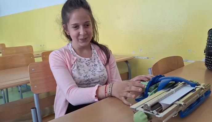 Ispred sebe, devojčica drži Brajevu mašinu i pojašnjava da nju koristi u svakodnevnom pisanju.