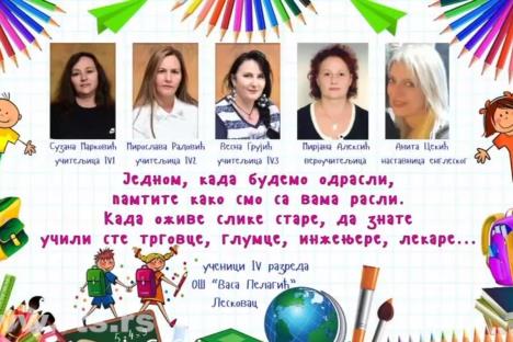 Roditelji i đaci četvrtog razreda Osnovne škole "Vasa Pelagić" u Leskovcu na neobičan način izrazili su zahvalnost učiteljicama i nastavnici engleskog jezika za izuzetnu saradnju, posvećenost i predan rad. Bilbord u centru grada nikoga nije ostavio ravnodušnim.