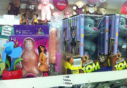 Vibrator i lutka na naduvavanje nalaze se na najbližoj pregradi do kase i na njoj ima svega i svačega, kao i uostalom u celoj radnji. Ostale igračke za decu odmah su sa druge strane police, tako da je klincima ova ponuda izuzetno vidljiva.