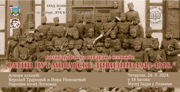 LOZNICA - Izložba ‘’Ratni put Moravske divizije od 1914. do 1918. godine“ biće otvorena sutra u Muzeju Jadra povodom 110 godina od početka Prvog svetskog rata i borbi u kojima je učestvovala Moravska divizija tokom Cerske operacije i Bitke na Drini 1914. godine.