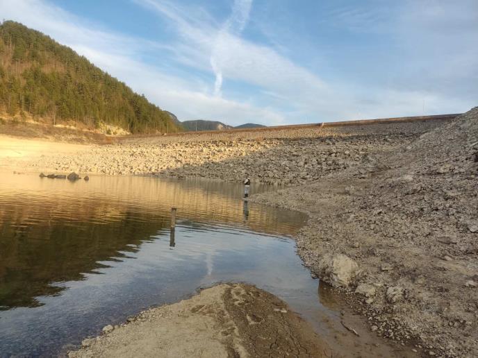 Voda je toliko opala da su obale opustošene, vire panjave davno posečenog drveća, blatnjave stene, a na kamenjima milioni školjki. Dok gazite čuje se krckanje osušenih školjki. Stručnjaci kažu da je reč o zebrastim školjkama.