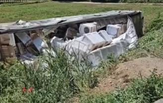 Kako se može videti na društvenim mrežama, kamion se prevrnuo pored puta i pričinjena je velika šteta.