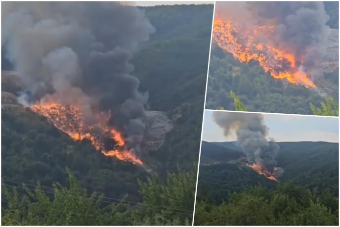 Prema rečima stanovnika okolnih naselja čuju se eksplozije a vetar koji duva jako otežava gašenje požara.