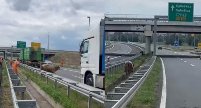 Naime, kako prenosi Instagram stranica "192_rs", odbegli bik je šetao auto-putem, dok su putari i policija pokušali da ga savladaju.