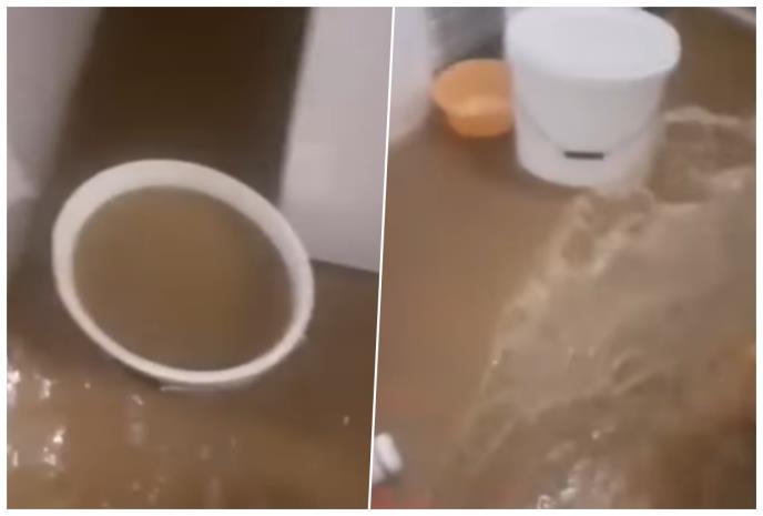 Domaćini iz prizemlja, kuće na snimku, izbacuju vodu iz kupatila i hodnika lavorom i lopatom.