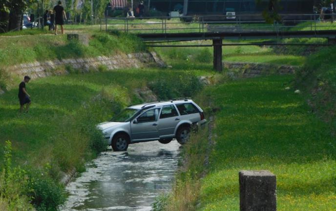 Tragovi u travi pokazuju da je vozilo sa improvizovanog parkinga, koji uglavnom koriste prodavci sa buvljaka, sletelo i završilo poprečeno uŠtiri. Srećom vodostaj je nizak pa su kola ostala na suvom i tamo gde su pala.