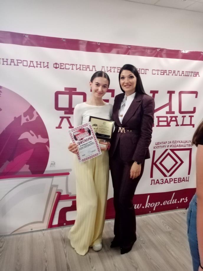 Njen mentor je Nela Dimitrijević, profesor srpskog jezika i književnosti. Nagrade su svečano uručene juče u Lazarevcu.
