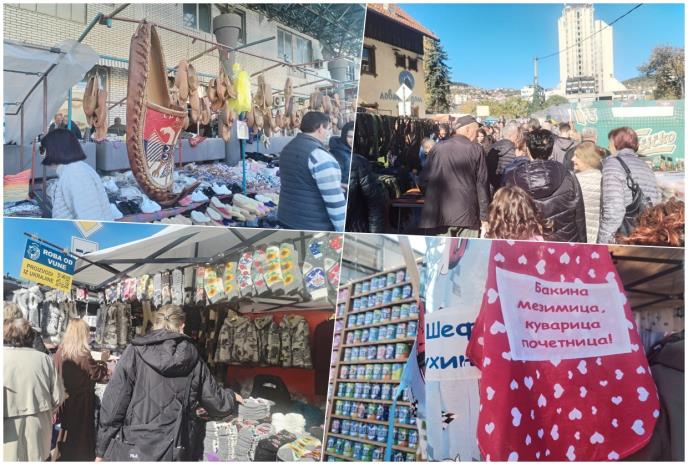 Sa svih strane trgovci nude i hvale svoju robu: zavese vrlo jeftino, za posetljinu dođite i pitajte za cenu, najukusnija šećerna vuna, farmerke 800 dinara, da vidite bolje – naočari za vid, ručni radovi na ukrajinski način… Tu je i nameštaj, a veliku pažnju privlači i tezga sa kuhinjskim keceljama i napisima na njima. “Super kuvam, a tako i izgledam!”, “Kuvarica na ivici nervnog sloma!”, “Svekrva koja najbolje kuva!”…